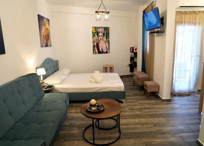 Ionos Dragoumi busstoppested ligger 5 minutters gang fra indkvarteringen.